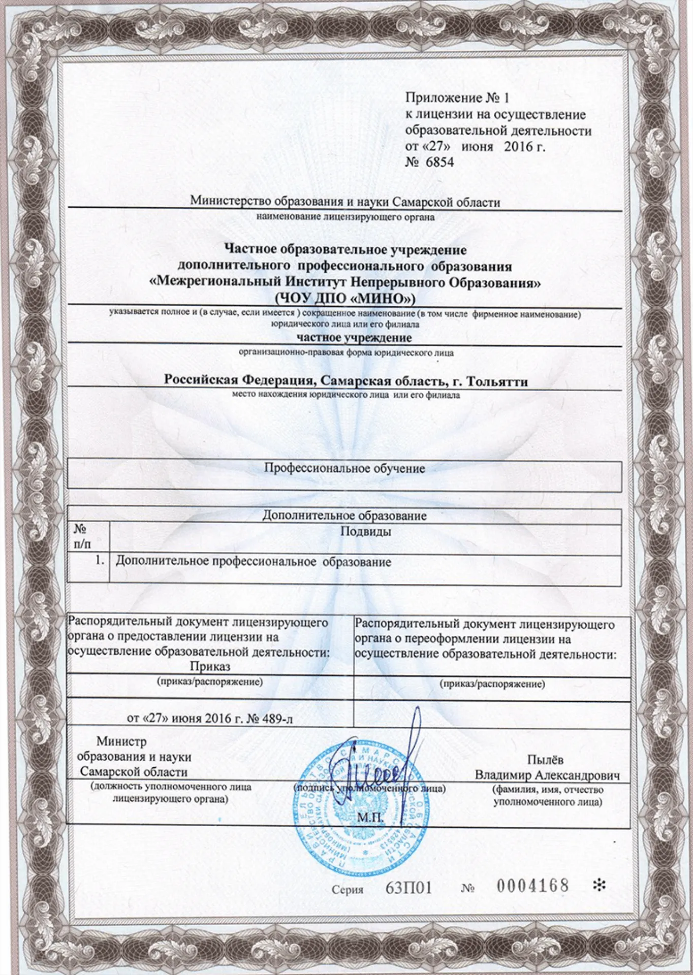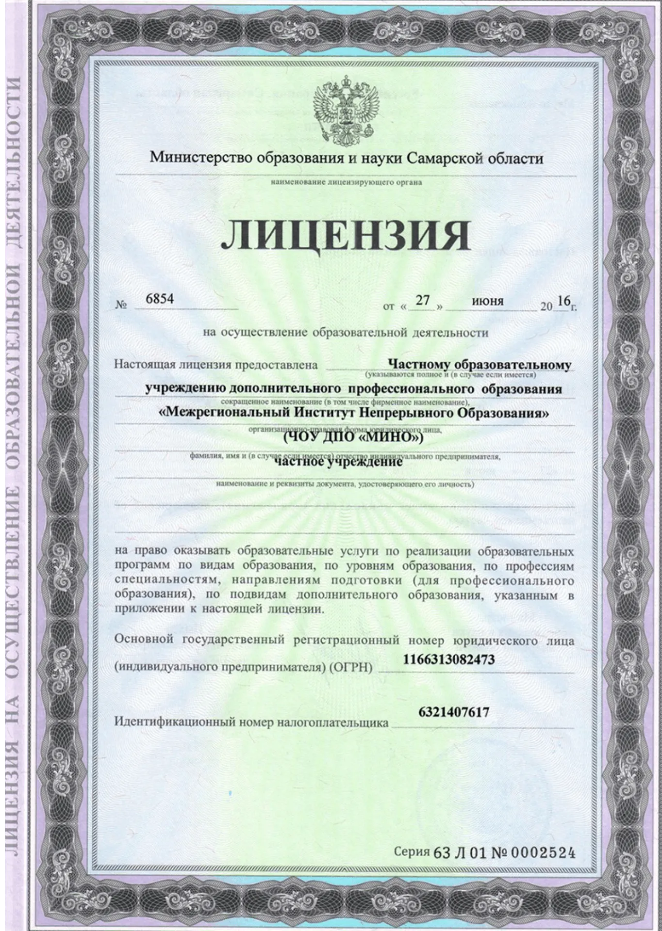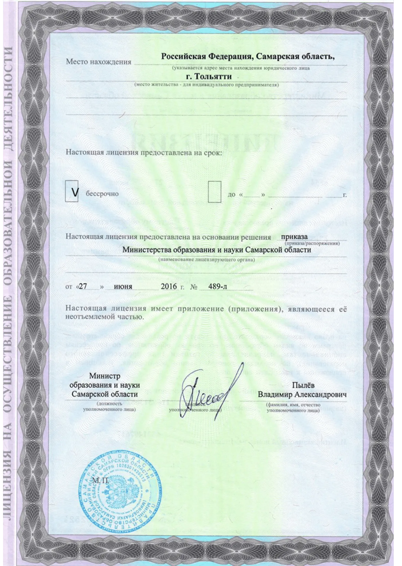 Лицензия №6854 серия 63 Л01 №0002524 от 27.06.2016г. выдана Министерством образования и науки Самарской области.